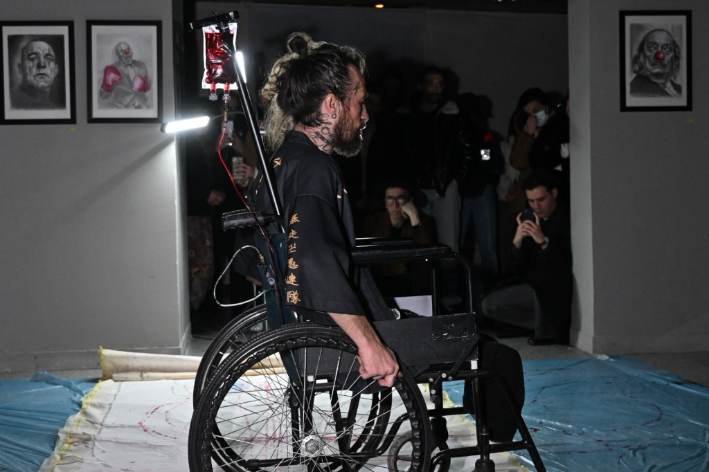 Öncelikle boya değil gerçekten kan kullandığımı söylemeli miyim emin değilim. Yaptığım palyaçolardan korkan insanlar bunu öğrenirse ne düşünür bilmiyorum. Bu, performansımı bir çeşit ayin yapar mı ?Bunun dışında bu performans, bedenin sanatın içinde bir araç değil, doğrudan sanatın kendisi olduğunu gösterme çabası. İnsan, dünyayla yalnızca gözleriyle değil, bedeniyle de anlam kurar. Hareketlerimiz, jestlerimiz, duruşumuz..Bunların hepsi anlam taşır. Sandalyemi sürerek, kanı tekerlere akıtarak, bedenimi kullanarak yarattığım izler, rastlantısallık dışında ; bilincin ve bilinçdışının ortak hareketiyle oluşmuş birer işaret gibidirler.