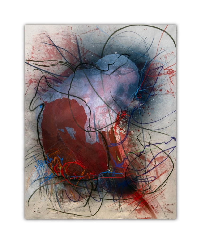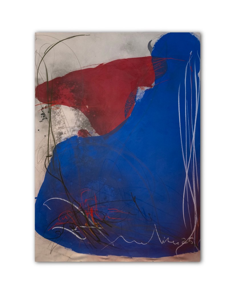 Untitled, mixed media on raw canvas, 150 × 200 cm, 2025