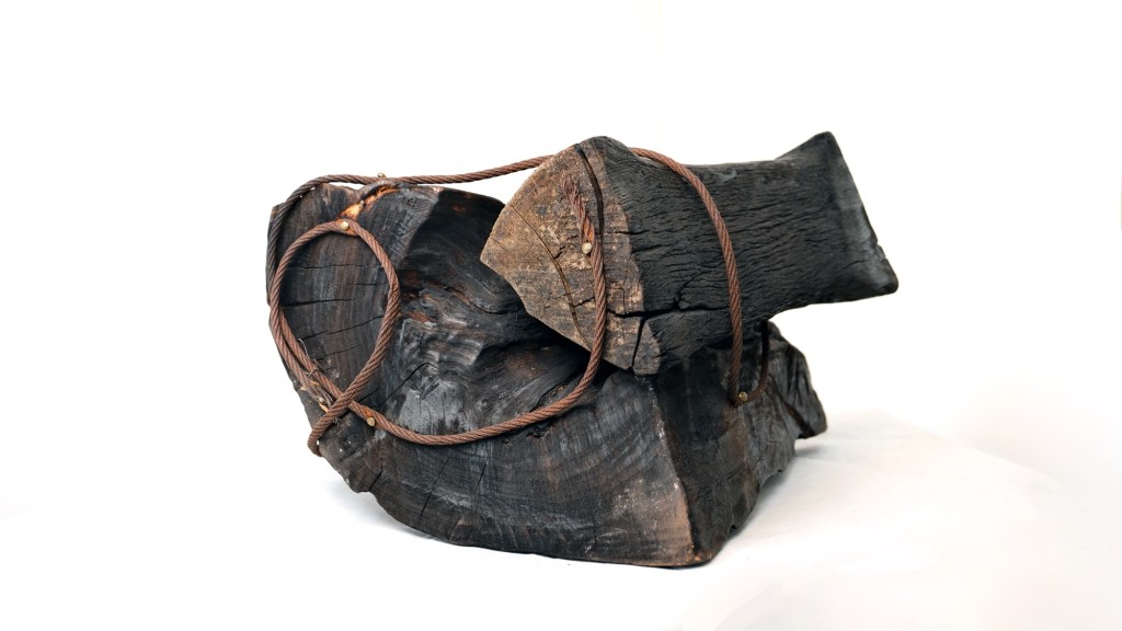 In the sculptures I begin by burning the wood, I sometimes construct the structure by following the natural movement within the wood. Other times, I shape a muddy texture formed by combining small pieces. In the two sculptures seen here, I built new structures by combining the natural form of the wood with other forms. I made the fixing elements visible. In this way, I wanted the structure to be read through movement.”
