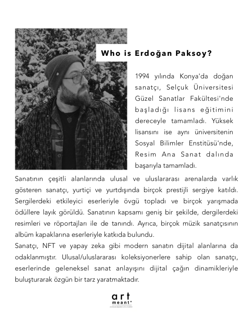 Krizler, kaoslar ve dönüşümlerle şekillenen bir dünyada, Erdoğan’ın sanatı hem bir yansıma hem de bir cevap niteliği taşıyor. Kişisel hafızayla toplumsal deneyimi buluşturan eserlerinde, distopik gerçeklikleri çarpıcı bir görsel dille aktarıyor.