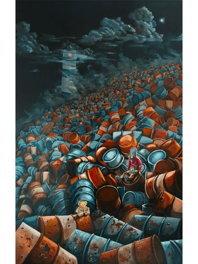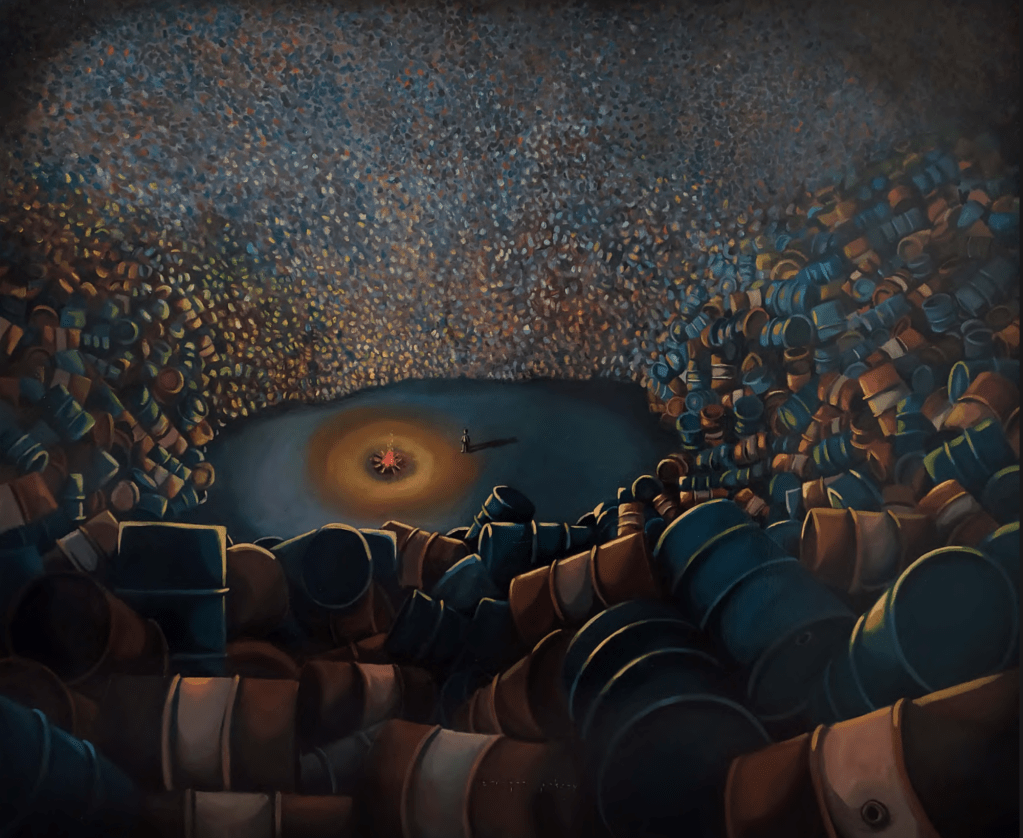 “Gece İçin Bir Mum Düşledim” isimli eserinde üst üste yığılmış variller, hem yer hem gökyüzünü adeta kuşatıyor, bu doğrudan bir çevresel tahribat ya da insan eli ile yaratılmış bir distopya izlenimi yaratıyor. Renkler çoğu eserinde kullandığın gibi bu eserinde de koyu tonlarda. Bu hem kaotik hem de büyüleyici. Bu zıtlık modern dünyanın güzellikleri ve çöküşü arasındaki ince çizgiyi anlatıyor gibi. Bu çöküş ve güzellik arasında sen bir birey olarak kendini nerede görüyorsun?