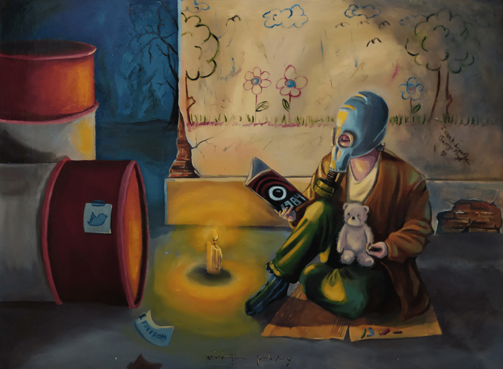 Bu eseri üretirken George Floyd’un öldürülme anındaki *nefes alamıyorum* sözleri beni derinden etkiledi. Bu distopya içinde her aldığımız nefes bir işkence mi, yoksa yarına dair bir umut mu; hâlâ emin değilim. Çocuksal travmalar ve arzulanan mutluluklar bir çocuğun boyama kitabında saklı kalırken kirlenen bu dünyaya direnen bir çocuğun tek desteği oyuncak ayı olabilir…